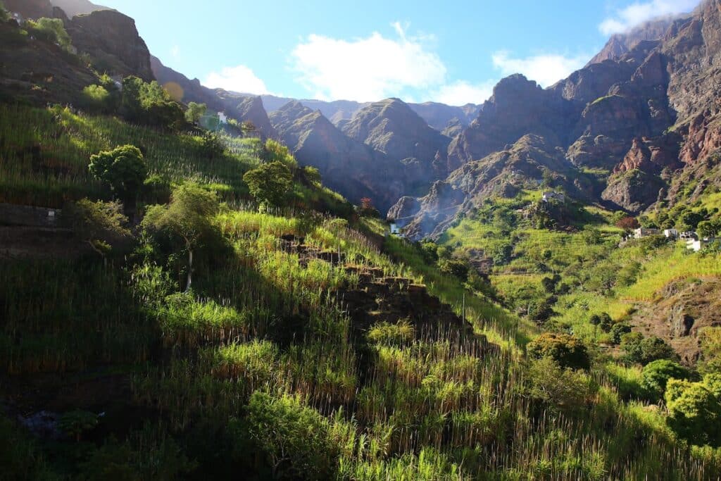 Ce qui distingue Santo Antão des autres îles, c’est son réseau exceptionnel de chemins pavés en pierre, héritage des siècles passés. Ces sentiers muletiers, incroyablement bien entretenus, serpentent à flanc de falaise, traversent des terrasses cultivées et relient des hameaux isolés. Le microclimat du nord-est apporte des pluies qui nourrissent une végétation luxuriante : cannes à sucre, caféiers, bananiers, manguiers et vignes couvrent les vallées encaissées. À l’opposé, l’ouest aride offre des paysages lunaires et minéraux d’une beauté saisissante.
